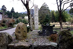 寝物語の里碑の奥に、廃寺となった 「永正山妙光寺」の石碑と、 「寺跡」の丸石碑と、鬼瓦があり、広大な境内跡地を残している。