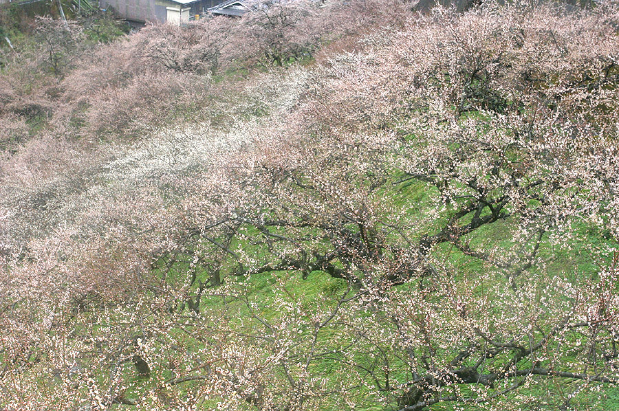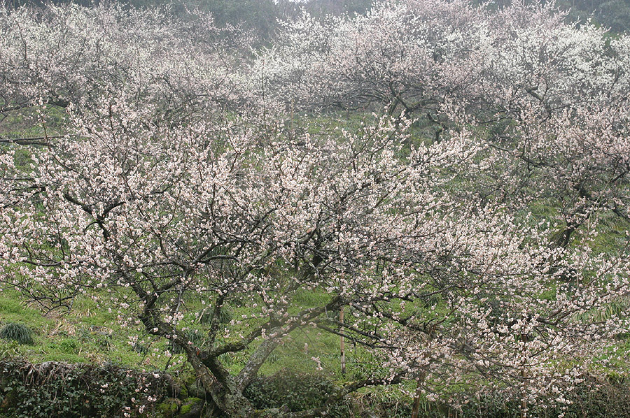 二月下旬から三月上旬に、純白や淡い紅色の梅花が雲海のような風景が広がる。