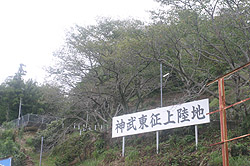 国道から見えるところには、「神武天皇東征上陸の地」の看板が小山にある。